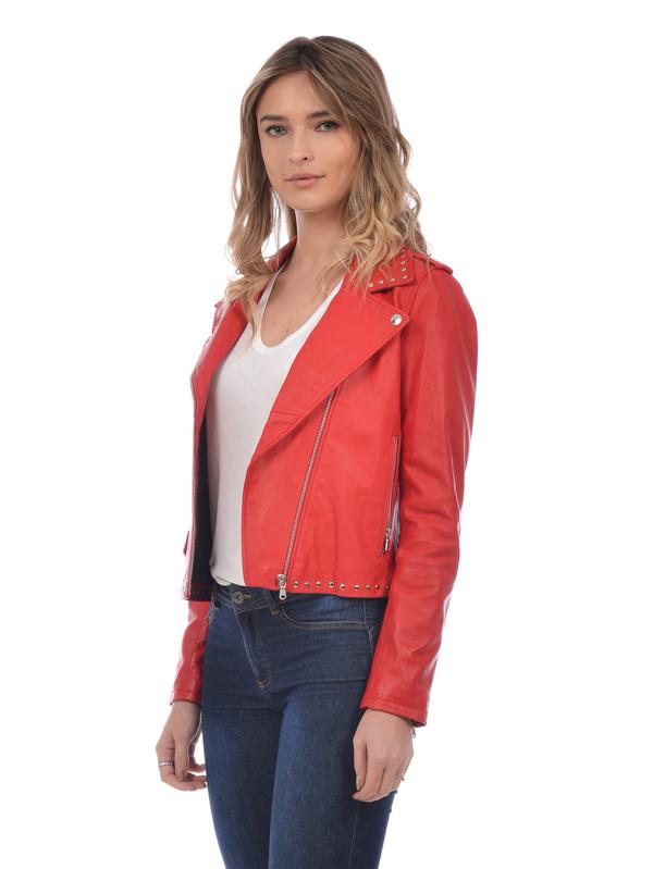 Women leather jacket with asymmetrical zip 100% Lamb leather Front vertical zip pockets Pocket detail on right side Stud detail along lapel and hem Slim Fit